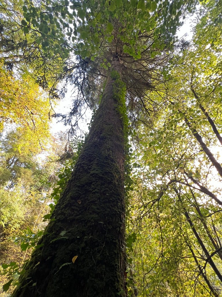A photo of a tall and straight tree at the waterfall.