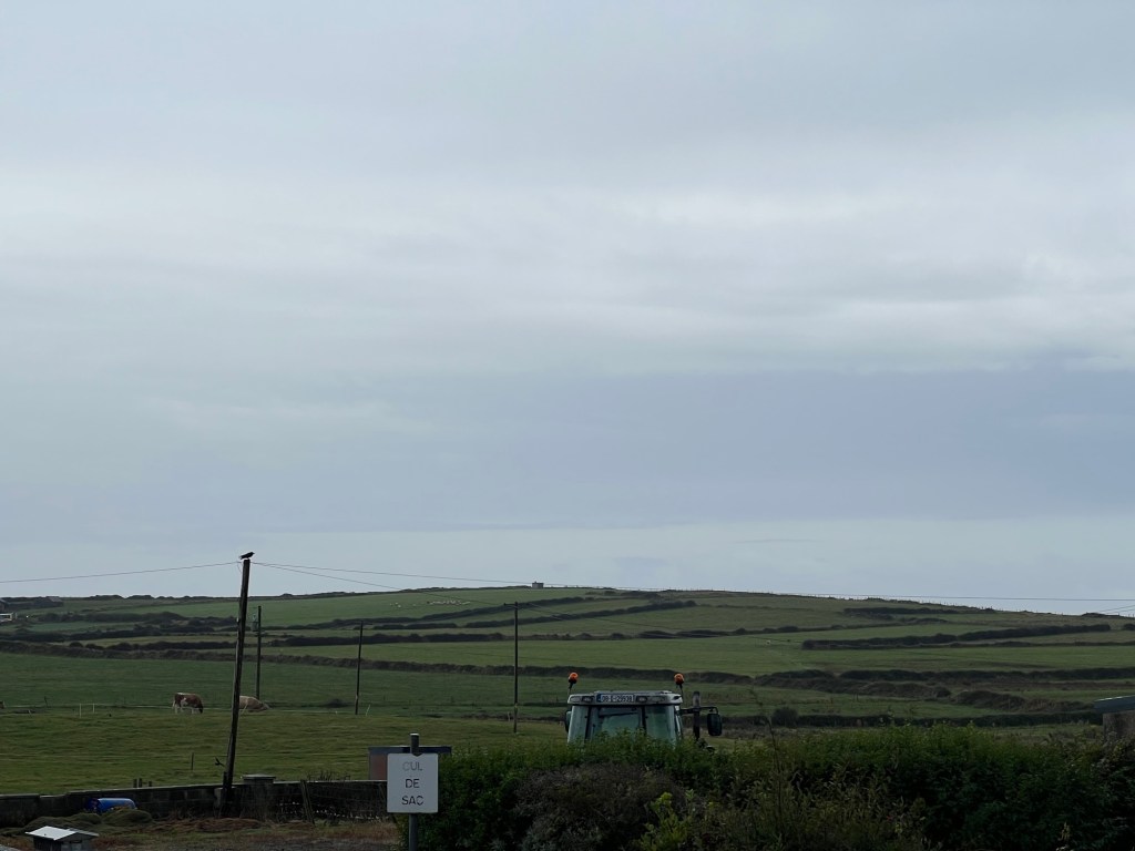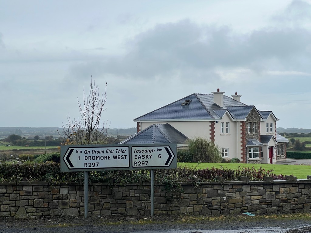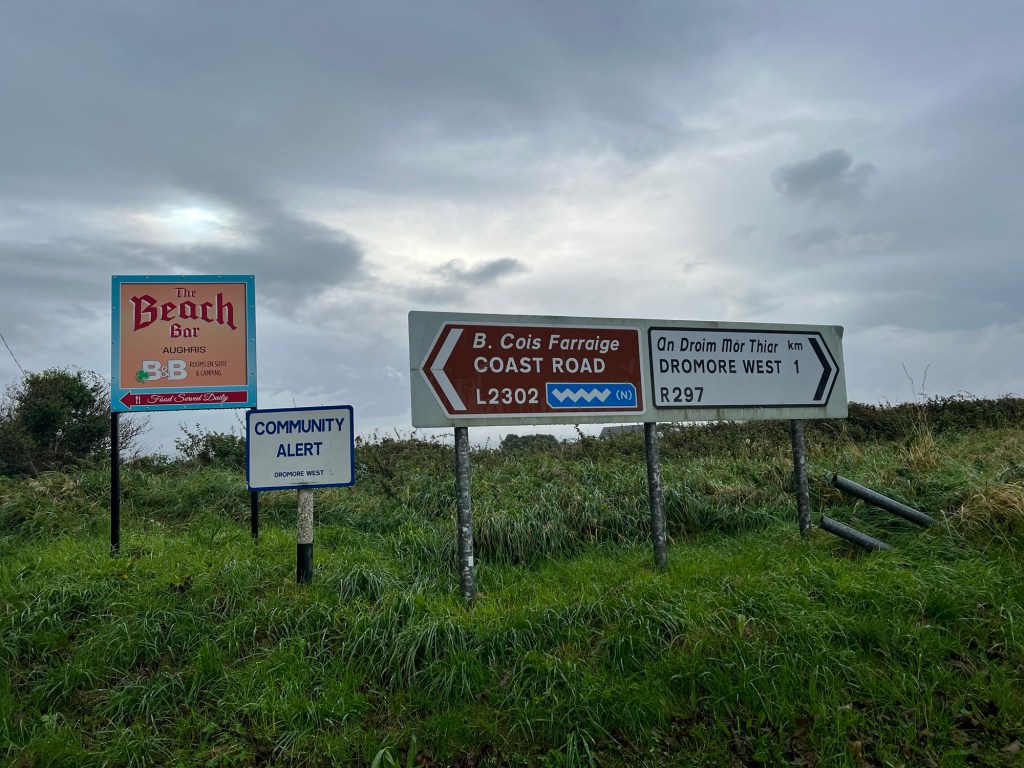 A road sign. The blue wriggly line symbolises the “Wild Atlantic Way”. It’s a drive that travels along the west coast of Ireland.