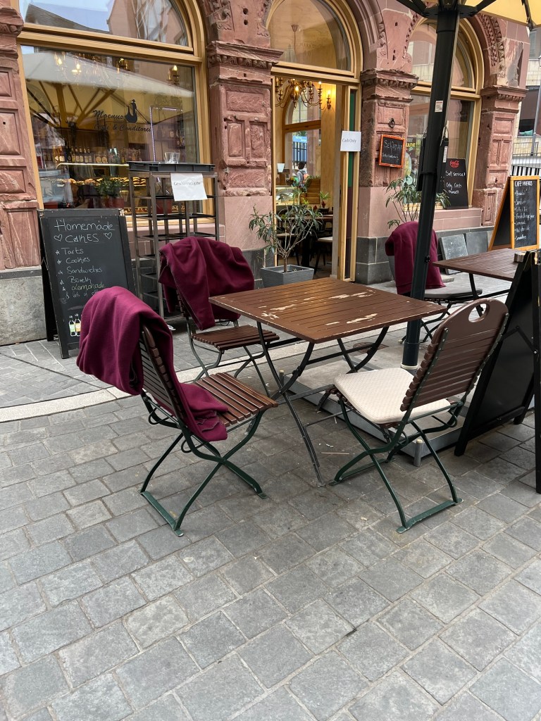 Rugs in outside chairs to keep people warm while having coffee l guess.