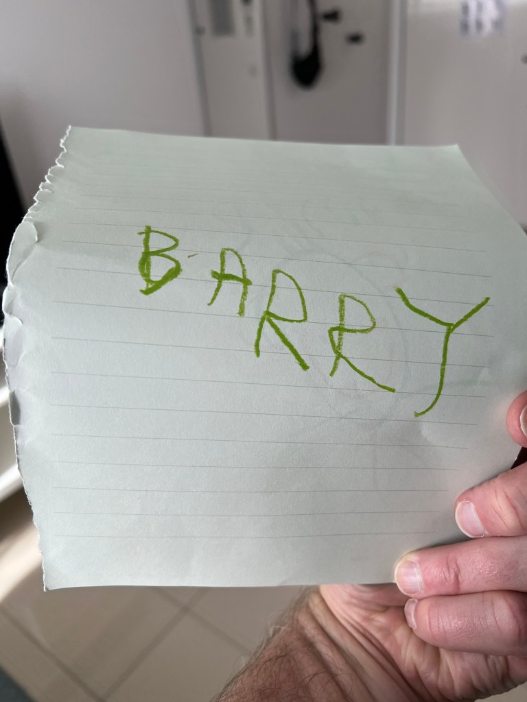 It has a little more hair than l have! He also wrote my name on the back. Not bad for a four year old.