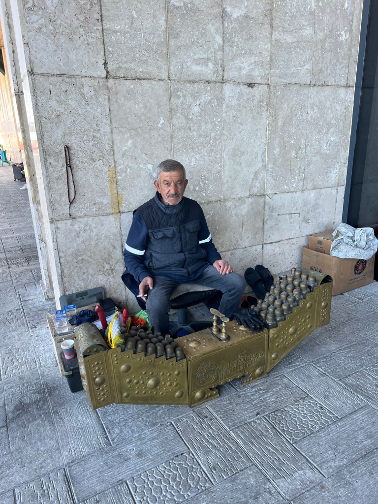 I took a photo of an old fashioned shoe shiner set up outside the bus terminal in Tekridag.