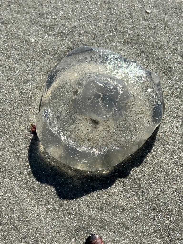 Then l walked along the sand and saw the remains of a jelly fish.