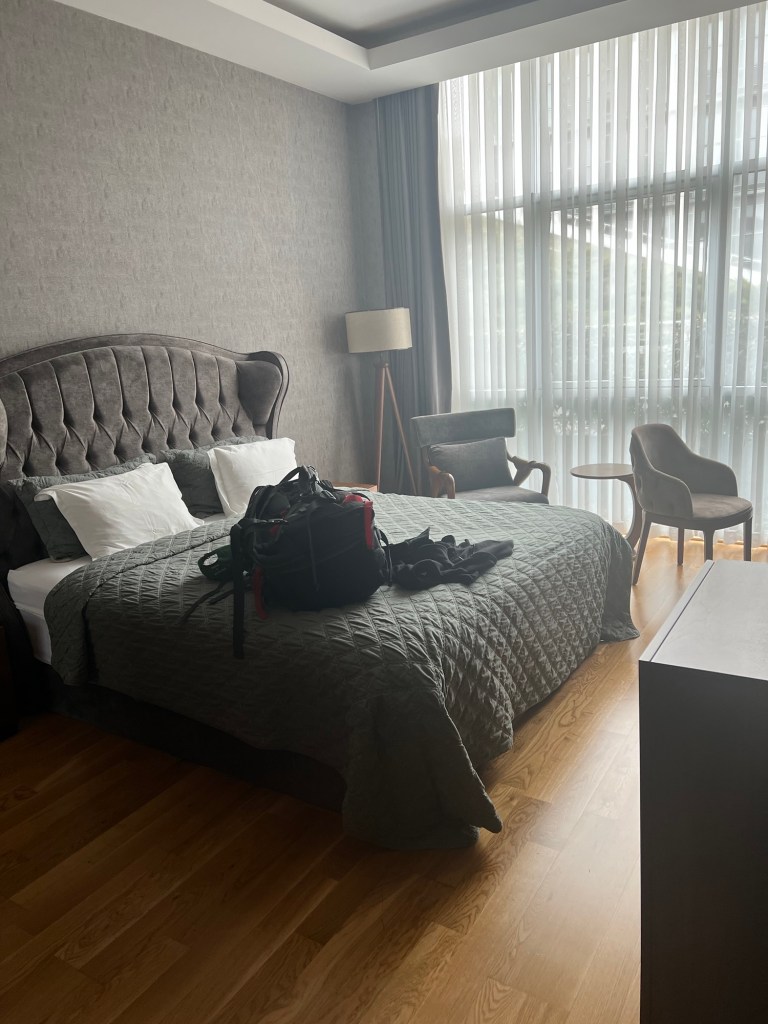The accommodation where l’m staying for the night is part of a university for sports from what l can gather. Being a university, it’s state managed, with significant security yo go through. There were police with a machine gun and mirrors on a pole to check under vehicles.