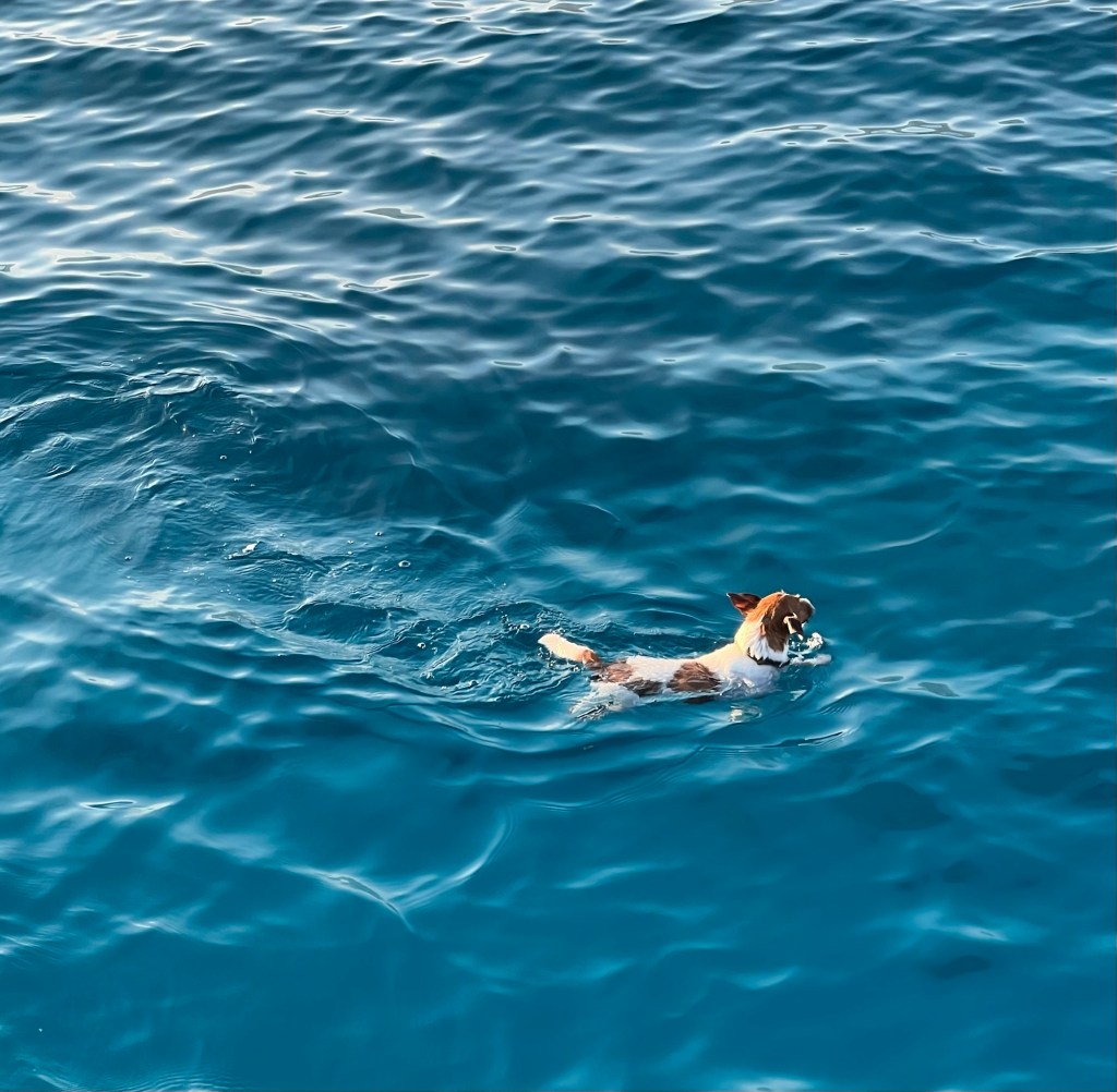 A person brought their dog along on the boat. The dog loved his time swimming.